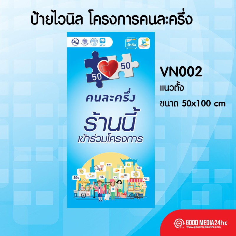 ป้ายโครงการ คนละครึ่ง ชิม ชอป ทั่วไทย รัฐออกให้ 50% ร้านค้าที่เข้าร่วมโครงการ สนใจสั่งได้เลยจร้า เลือกขนาด แก้ไขแบบ ใส่โลโก้ร้านค้าได้ตาม.